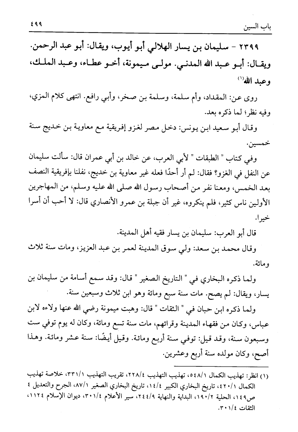 ٢٣٩٩ - سليمان بن يسار الهلالي أبو أيوب، ويقال: أبو عبد الرحمن. ويقال: أبو عبد اللَّه المدني. مولى ميمونة، أخو عطاء، وعبد الملك، وعبد اللَّه (¬١)