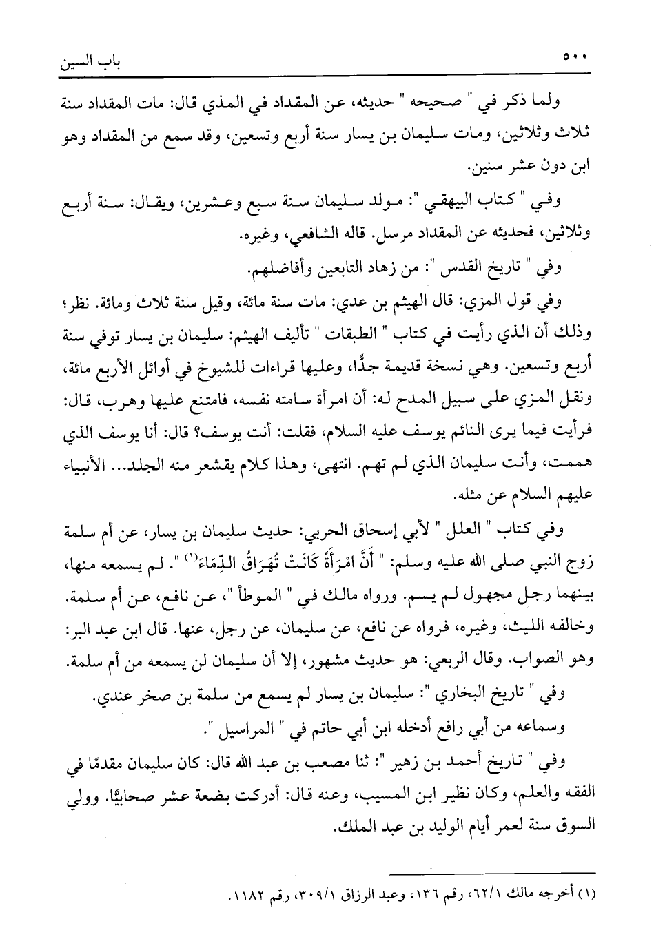وفي قول المزي: قال الهيثم بن عدي: مات سنة مائة، وقيل سنة ثلاث ومائة. نظر؛ وذلك أن الذي رأيت في كتاب "الطبقات" تأليف الهيثم: سليمان بن يسار توفي سنة أربع وتسعين. وهي نسخة قديمة جدًّا، وعليها قراءات للشيوخ في أوائل الأربع مائة، ونقل المزي على سبيل المدح له: أن امرأة سامته نفسه، فامتنع عليها وهرب، قال: فرأيت فيما يرى النائم يوسف عليه السلام، فقلت: أنت يوسف؟ قال: أنا يوسف الذي هممت، وأنت سليمان الذي لم تهم. انتهى، وهذا كلام يقشعر منه الجلد. . . الأنبياء عليهم السلام عن مثله.