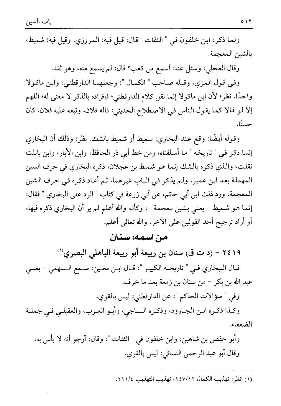 وقوله أيضًا: وقع عند البخاري: سميط أو شميط بالشك. نظر؛ وذلك أن البخاري إنما ذكر في "تاريخه" ما أسلفناه، ومن خط أبي ذر الحافظ، وابن الأبار، وابن بابلت نقلت، والذي ذكره بالشك إنما هو شميط بن عجلان، ذكره البخاري في حرف السين المهملة بعد ابن عمير، ولم يذكر في الباب غيرهما، ثم أعاد ذكره في حرف الشين المعجمة، ورد ذلك ابن أبي حاتم، عن أبي زرعة في كتاب "الرد على البخاري" فقال: إنما هو شميط -يعني بشين معجمة-، وكأنه واللَّه أعلم لم ير أن البخاري ذكره فيها، أو أراد ترجيح أحد القولين على الآخر. واللَّه تعالى أعلم.