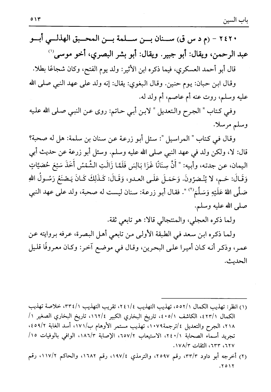 ٢٤٢٠ - (م د س ق) سنان بن سلمة بن المحبق الهذلي أبو عبد الرحمن، ويقال: أبو جبير. ويقال: أبو بشر البصري، أخو موسى (¬١)