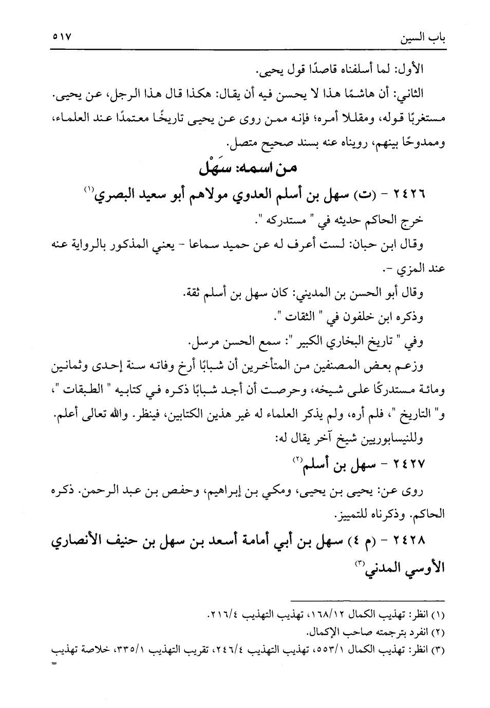 الثاني: أن هاشمًا هذا لا يحسن فيه أن يقال: هكذا قال هذا الرجل، عن يحيى. مستغربًا قوله، ومقللا أمره؛ فإنه ممن روى عن يحيى تاريخًا معتمدًا عند العلماء، وممدوحًا بينهم، رويناه عنه بسند صحيح متصل.