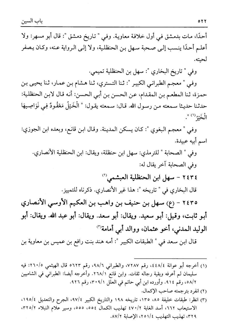 أحدًا، مات بدمشق في أول خلافة معاوية. وفي "تاريخ دمشق": قال أبو مسهر: ولا أعلم أحدًا ينسب إلى صحبة سهل بن الحنظلية، ولا إلى الرواية عنه، وكان يصفر لحيته.