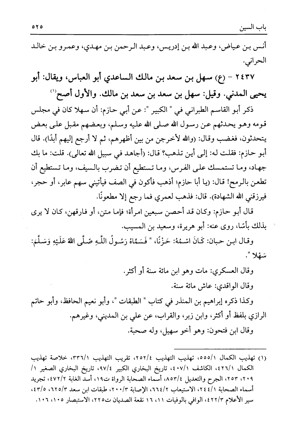 ٢٤٣٧ - (ع) سهل بن سعد بن مالك الساعدي أبو العباس، ويقال: أبو يحيى المدني. وقيل: سهل بن سعد بن سعد بن مالك. والأول أصح (¬١)