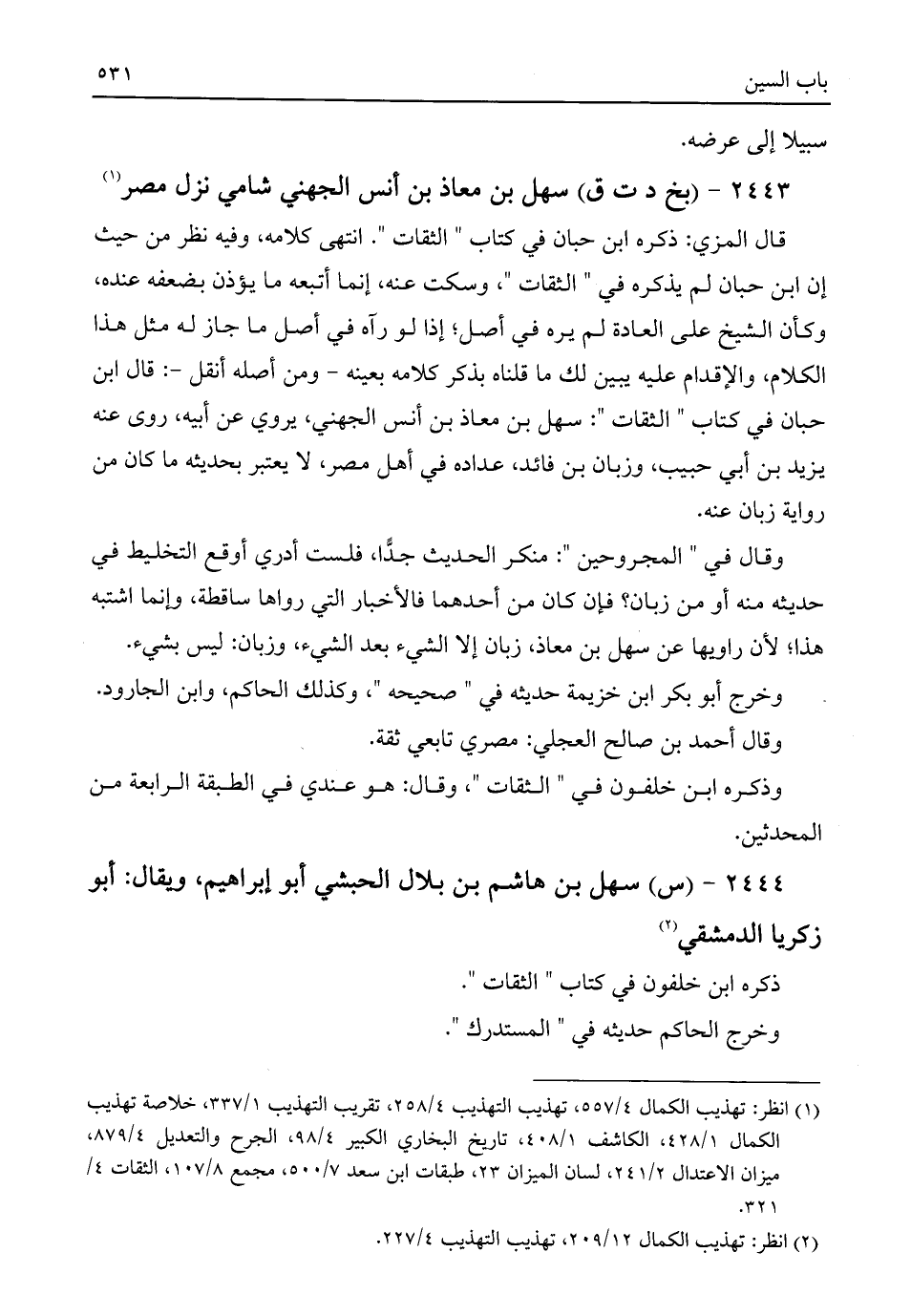 قال المزي: ذكره ابن حبان في كتاب "الثقات". انتهى كلامه، وفيه نظر من حيث إن ابن حبان لم يذكره في "الثقات"، وسكت عنه، إنما أتبعه ما يؤذن بضعفه عنده، وكأن الشيخ على العادة لم يره في أصل؛ إذا لو رآه في أصل ما جاز له مثل هذا الكلام، والإقدام عليه يبين لك ما قلناه بذكر كلامه بعينه -ومن أصله أنقل-: قال ابن حبان في كتاب "الثقات": سهل بن معاذ بن أنس الجهني، يروي عن أبيه، روى عنه يزيد بن أبي حبيب، وزبان بن فائد، عداده في أهل مصر، لا يعتبر بحديثه ما كان من رواية زبان عنه.