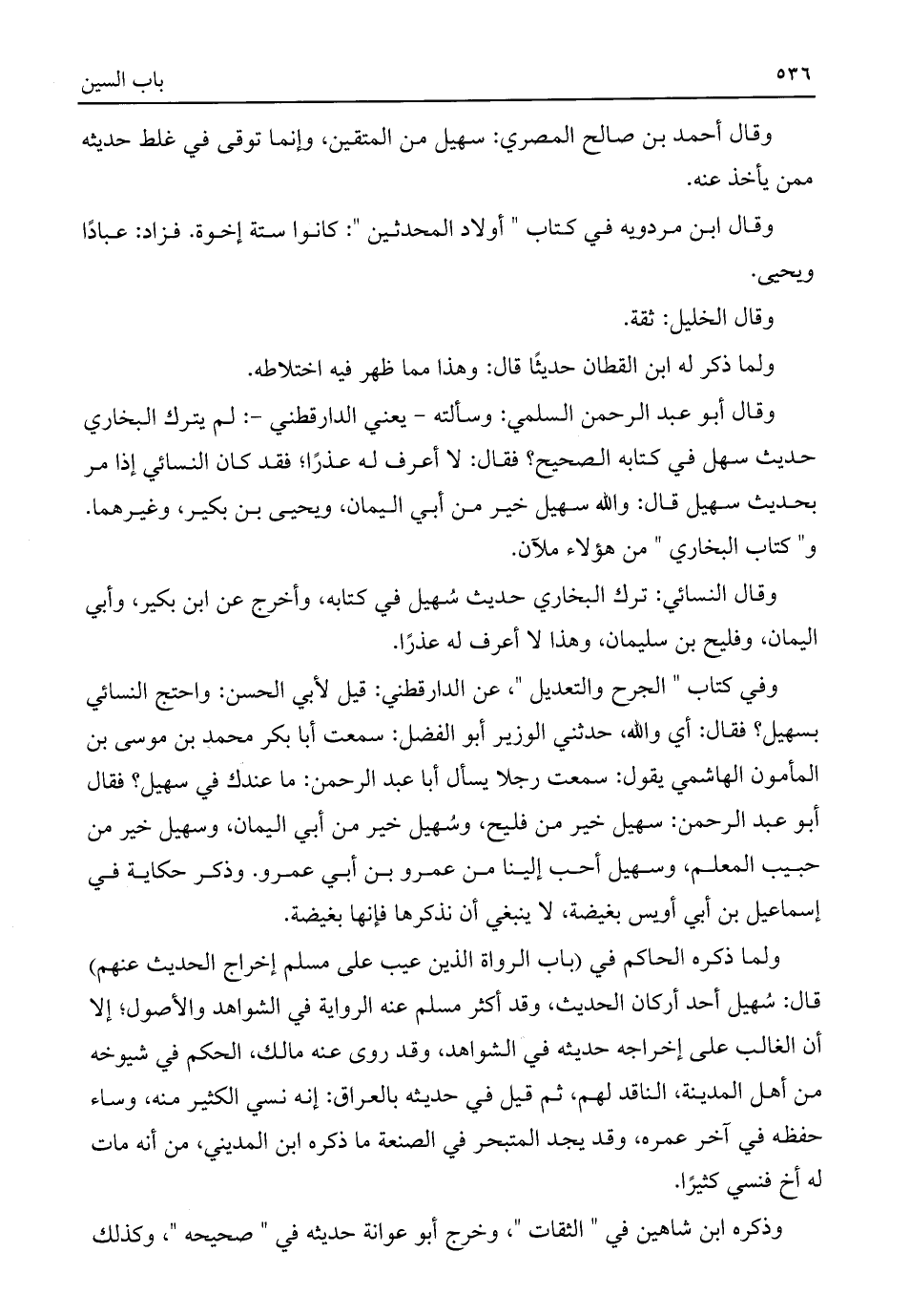 وفي كتاب "الجرح والتعديل"، عن الدارقطني: قيل لأبي الحسن: واحتج النسائي بسهيل؟ فقال: أي واللَّه، حدثني الوزير أبو الفضل: سمعت أبا بكر محمد بن موسى بن المأمون الهاشمي يقول: سمعت رجلا يسأل أبا عبد الرحمن: ما عندك في سهيل؟ فقال أبو عبد الرحمن: سهيل خير من فليح، وسُهيل خير من أبي اليمان، وسهيل خير من حبيب المعلم، وسهيل أحب إلينا من عمرو بن أبي عمرو. وذكر حكاية في إسماعيل بن أبي أويس بغيضة، لا ينبغي أن نذكرها فإنها بغيضة.