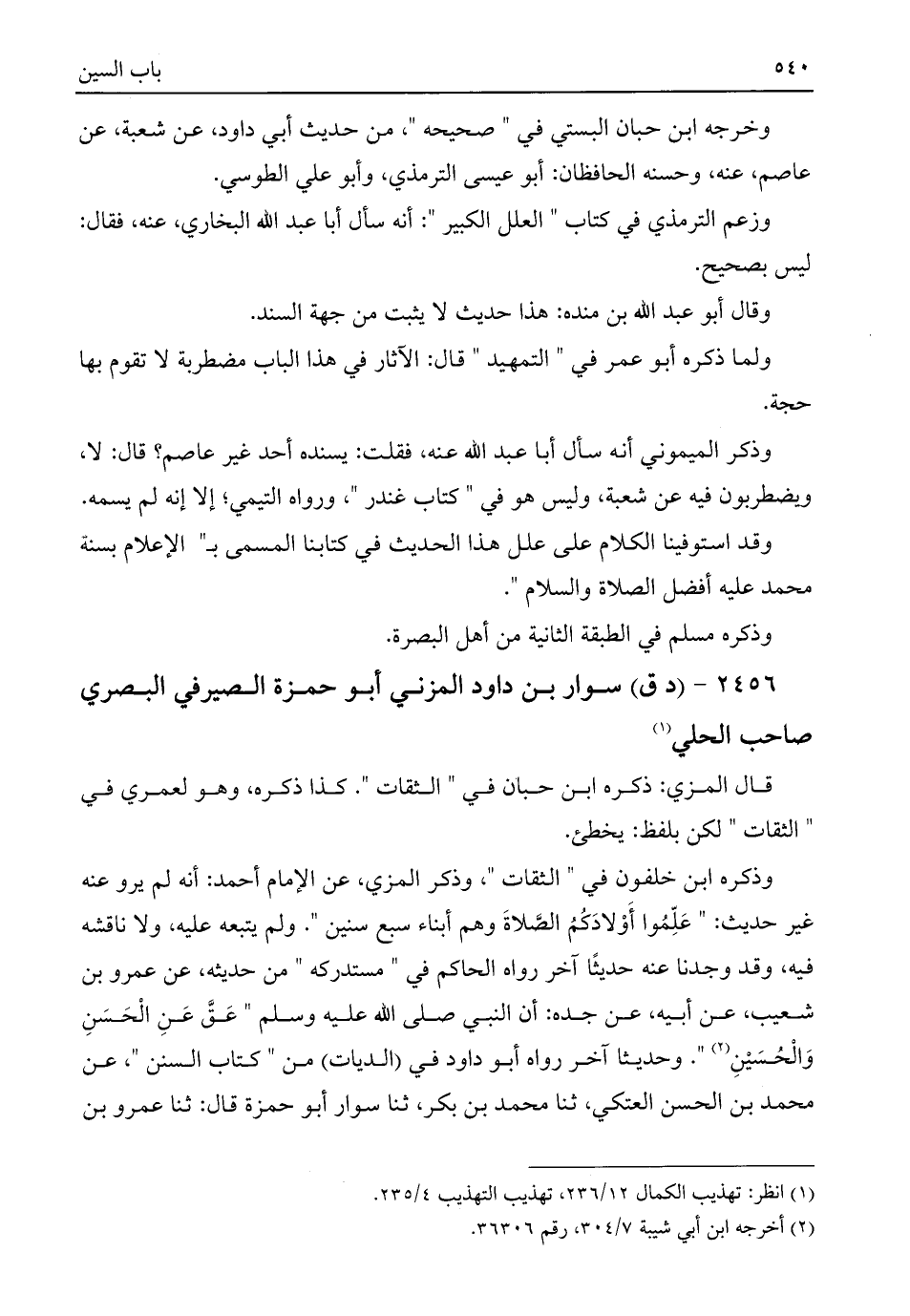 وذكره ابن خلفون في "الثقات"، وذكر المزي، عن الإمام أحمد: أنه لم يرو عنه غير حديث: "عَلِّمُوا أَوْلادَكُمُ الصَّلاةَ وهم أبناء سبع سنين". ولم يتبعه عليه، ولا ناقشه فيه، وقد وجدنا عنه حديثًا آخر رواه الحاكم في "مستدركه" من حديثه، عن عمرو بن شعيب، عن أبيه، عن جده: أن النبي صلى اللَّه عليه وسلم "عَقَّ عَنِ الْحَسَنِ وَالْحُسَيْنِ (¬٢) ". وحديثا آخر رواه أبو داود في (الديات) من "كتاب السنن"، عن محمد بن الحسن العتكي، ثنا محمد بن بكر، ثنا سوار أبو حمزة قال: ثنا عمرو بن