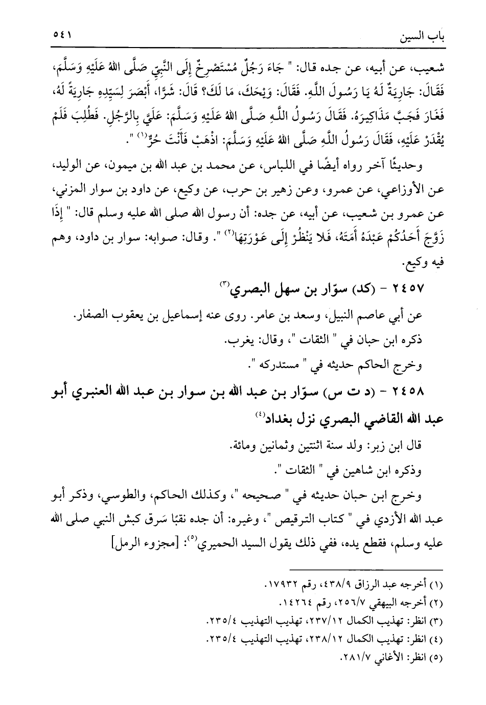 ٢٤٥٨ - (د ت س) سوّار بن عبد اللَّه بن سوار بن عبد اللَّه العنبري أبو عبد اللَّه القاضي البصري نزل بغداد (¬٤).