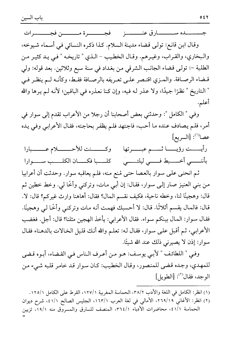 وفي "الكامل": وحدئني بعض أصحابنا أن رجلا من الأعراب تقدم إلى سوار في أمر، فلم يصادف عنده ما أحب، فاجتهد فلم يظفر بحاجته، فقال الأعرابي وفي يده عصا (¬١): [السريع]