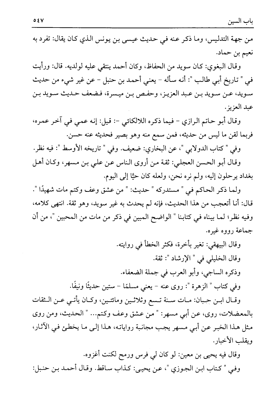 وقال البغوي: كان سويد من الحفاظ، وكان أحمد ينتقي عليه لولديه. قال: ورأيت في "تاريخ أبي طالب": أنه سأله -يعني أحمد بن حنبل- عن غير شيء من حديث سويد، عن سويد بن عبد العزيز، وحفص بن ميسرة، فضعف حديث سويد بن عبد العزيز.