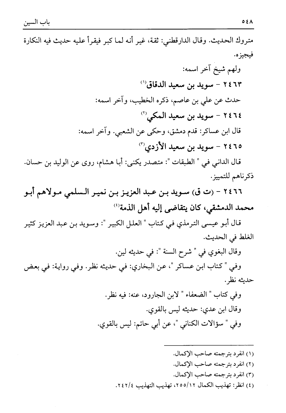 ٢٤٦٦ - (ت ق) سويد بن عبد العزيز بن نمير السلمي مولاهم أبو محمد الدمشقي، كان يتقاضى إليه أهل الذمة (¬٤)
