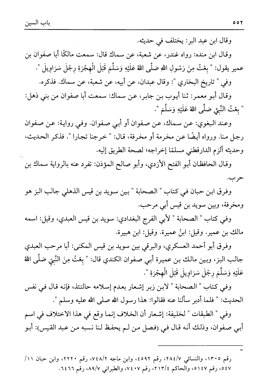 وعند البغوي: عن سماك، عن صفوان أو أبي صفوان. وفي رواية: عن صفوان رجل منا. ورواه أيضًا عن مخرمة أو مخرفة، قال: "خرجنا تجارا". فذكر الحديث، وحديثه ألزم الدارقطني مسلمًا إخراجه؛ لصحة الطريق إليه.
