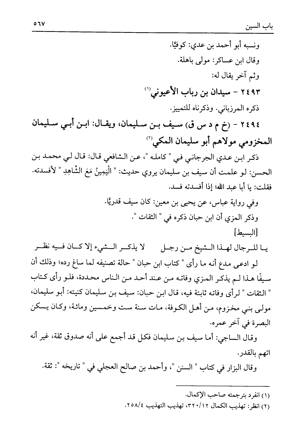 لو ادعى مدع أنه ما رأى "كتاب ابن حبان" حالة تصنيفه لما ساغ رده؛ وذلك أن سيفًا هذا لم يذكر المزي وفاته من عند أحد من الناس محددة، فلو رأى كتاب "الثقات" لرأى وفاته ثابتة فيه، قال ابن حبان: سيف بن سليمان كنيته: أبو سليمان، مولى بني مخزوم، من أهل الكوفة، مات سنة ست وخمسين ومائة، وكان يسكن البصرة في آخر عمره.