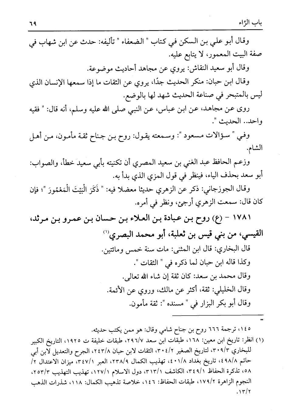 = ١٤٥، ترجمة ٦٦٦ روح بن جناح شامي وقال: هو ممن يكتب حديثه.
