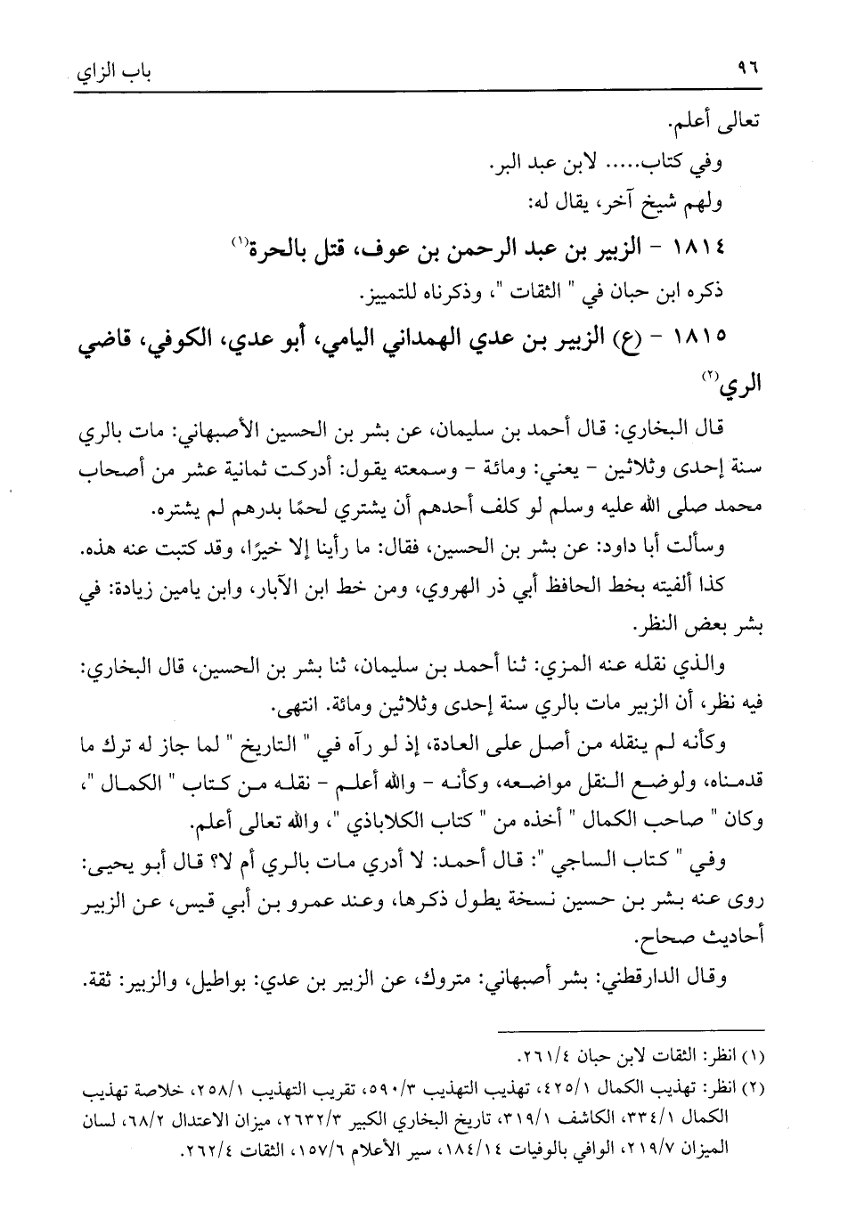 والذي نقله عنه المزي: ثنا أحمد بن سليمان، ثنا بشر بن الحسين، قال البخاري: فيه نظر، أن الزبير مات بالري سنة إحدى وثلاثين ومائة. انتهى.