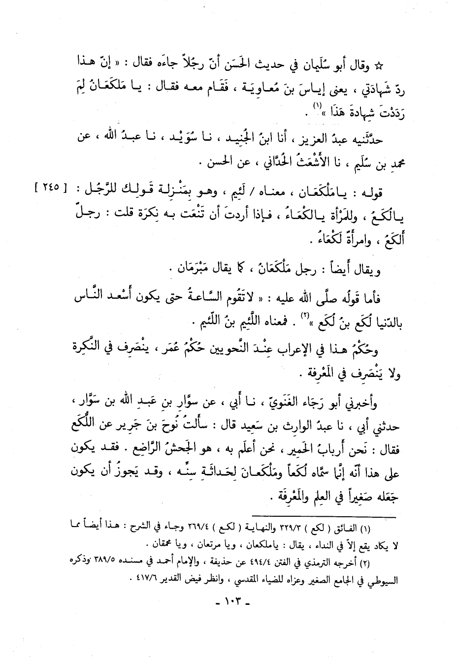 وأخبرني أبو رجاء الغنوي، أخبرنا أبي، عن سوار بن عبد الله بن سوار، حدثني أبي، أخبرنا عبد الوارث بن سعيد قال: سألت نوح بن جرير عن اللُكَعِ, فقال: نحن أرباب الحمير، نحن أعلم به، هو الجحش الراضع, فقد يكون على هذا أنه إنما سماه لكعا وملكعان؛ لحداثة سنه، وقد يجوز أن يكون جعله صغيرًا في العلم والمعرفة.