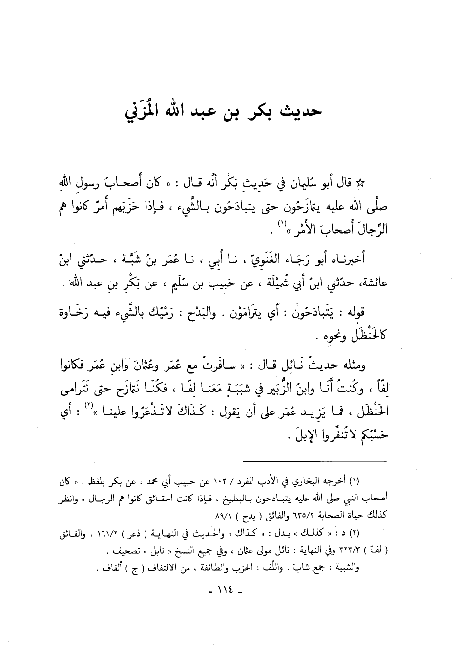 حديث بكر أنه قال: "كان أصحاب رسول اللَّه صَلَّى الله عليه وسلم يتمازحون, حتى يَتَبَادَحُون بالشيء ... "