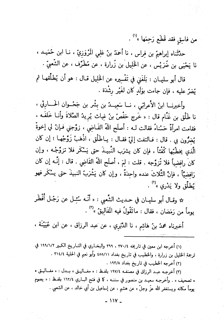 1 أخرجه ابن معين في: تاريخه: 370/ 4، 399, والبخاري في: التاريخ الكبير: 199/ 1/2, في ترجمة الخليل بن زرارة، والخطيب في: تاريخ بغداد: 455/ 11, وأبو نعيم في: الحلية: 314/ 4.