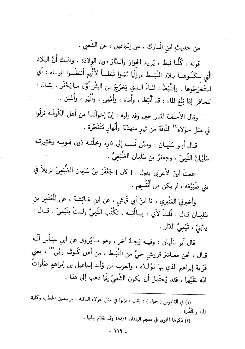 قَالَ أبو سليمان: وفيه وجْهٌ آخر، وهو ما يروى عَنِ ابْنِ عَبَّاسٍ أَنَّهُ قَالَ: "نحن معاشر قريش حي من النَّبَط، من أهل كوثا رَبَّى"2، يعني قرية إبراهيم الذي بها مولده، والعرب من ولد إسماعيل بن إبراهيم صلوات الله عليهما، فقد يحتمل أن يكون الشعبي إنما ذهب إلى هذا.