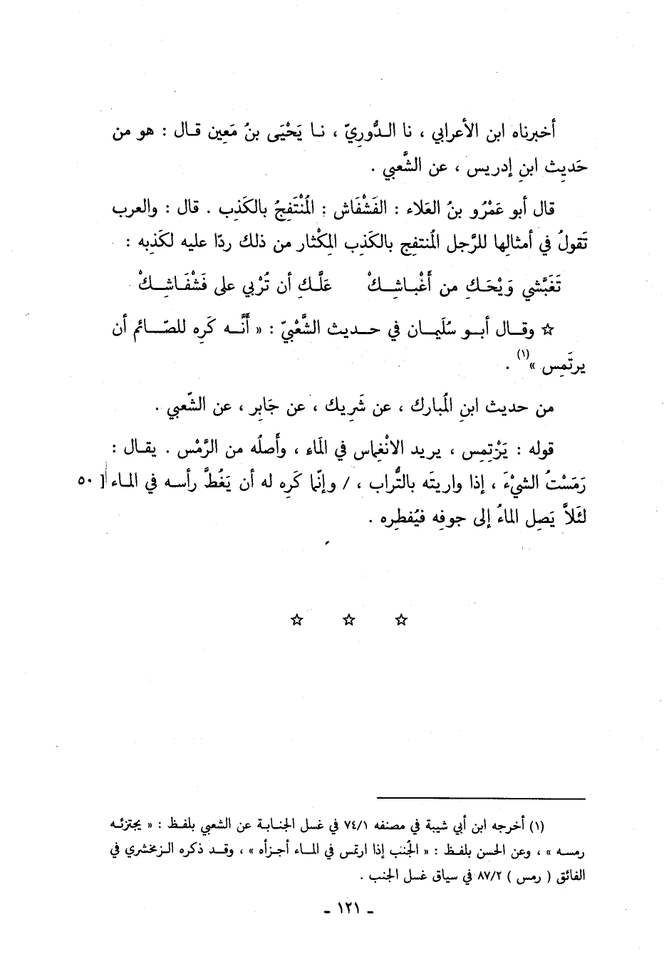 قَالَ أبو عمرو بن العلاء: الفَشْفَاش: المُنْتَفِجُ بالكذب, قال: والعرب تقول في أمثالها للرجل المنتفج بالكذب, المكثار من ذلك ردًّا عليه لكذبه: