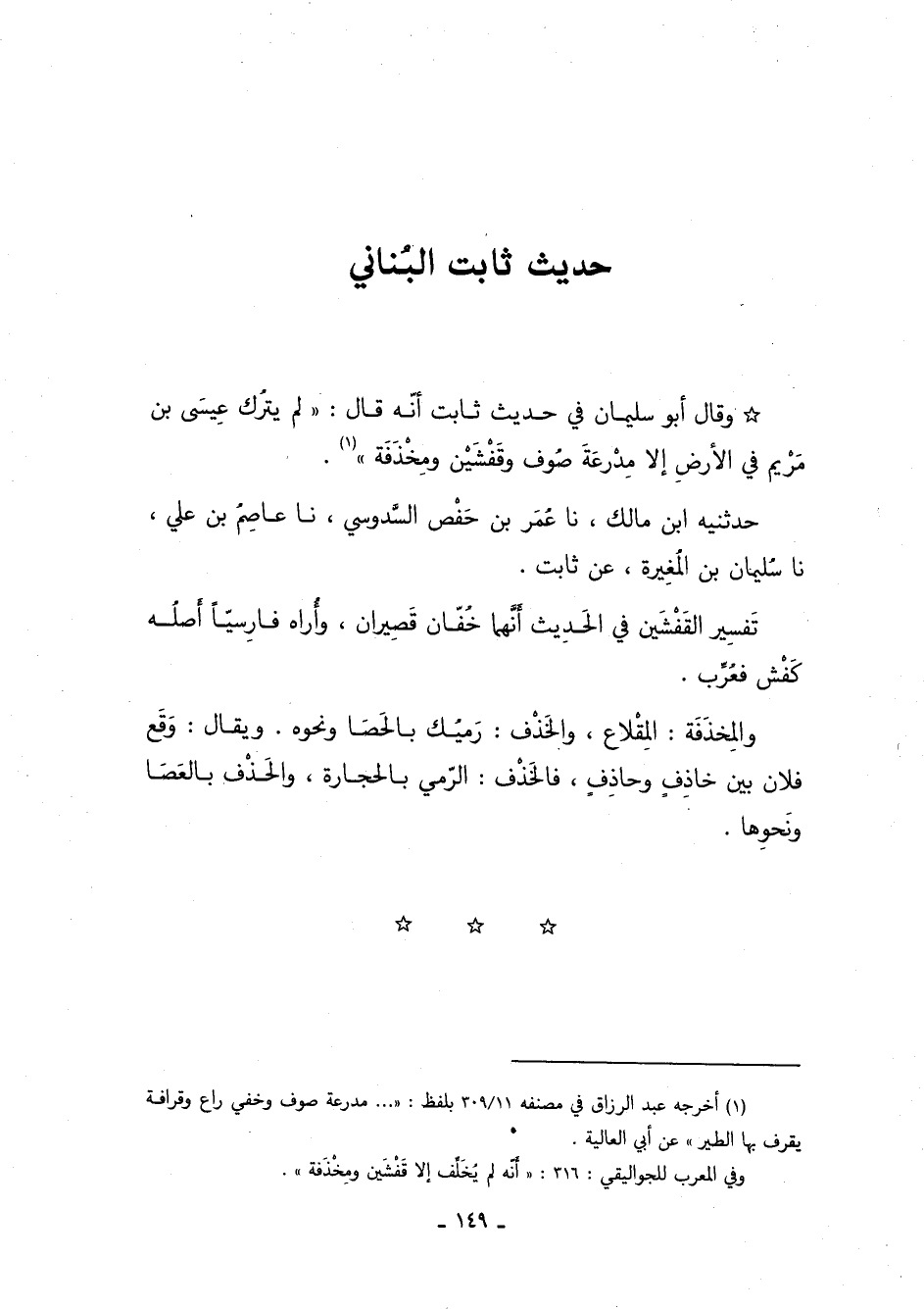 حديث ثابت أنه قال: "لم يترك عيسى بن مريم في الأرض إلا مِدْرعة صوف وقَفْشَينِ ومِخْذَفَة"