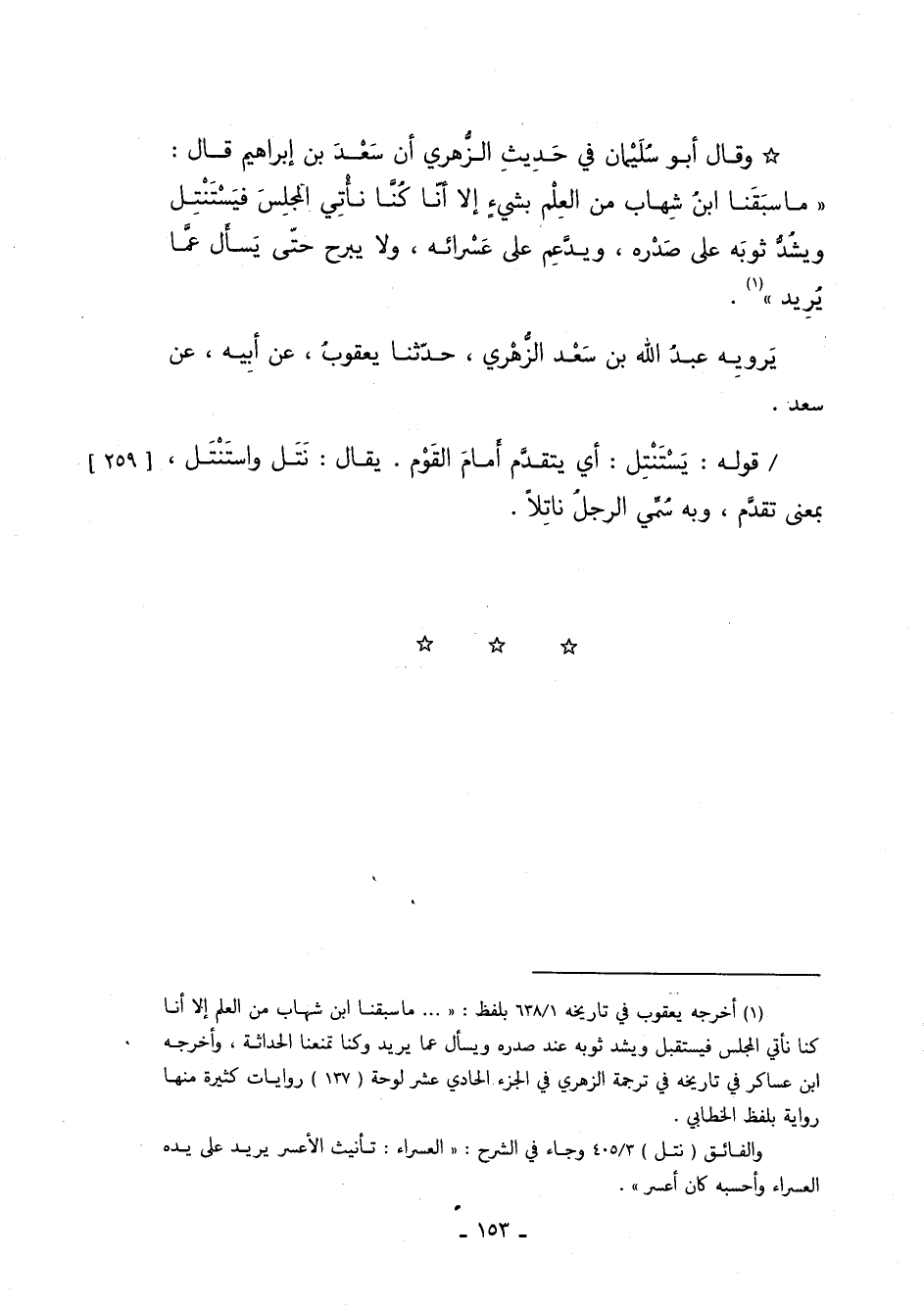 *وَقَالَ أَبُو سُلَيْمَانَ فِي حَدِيثِ الزهري أن سعد بن إبراهيم قال: "ما سَبَقْنَا ابن شهاب من العلم بشيء إلا أنا كنا نأتي المجلس, فَيَسْتَنْتِل, ويشُدُّ ثوبه على صدره, ويدَّعم على عَسْرَائِهِ ولا يبرح حتى يَسْأَلُ عما يريد"1.
