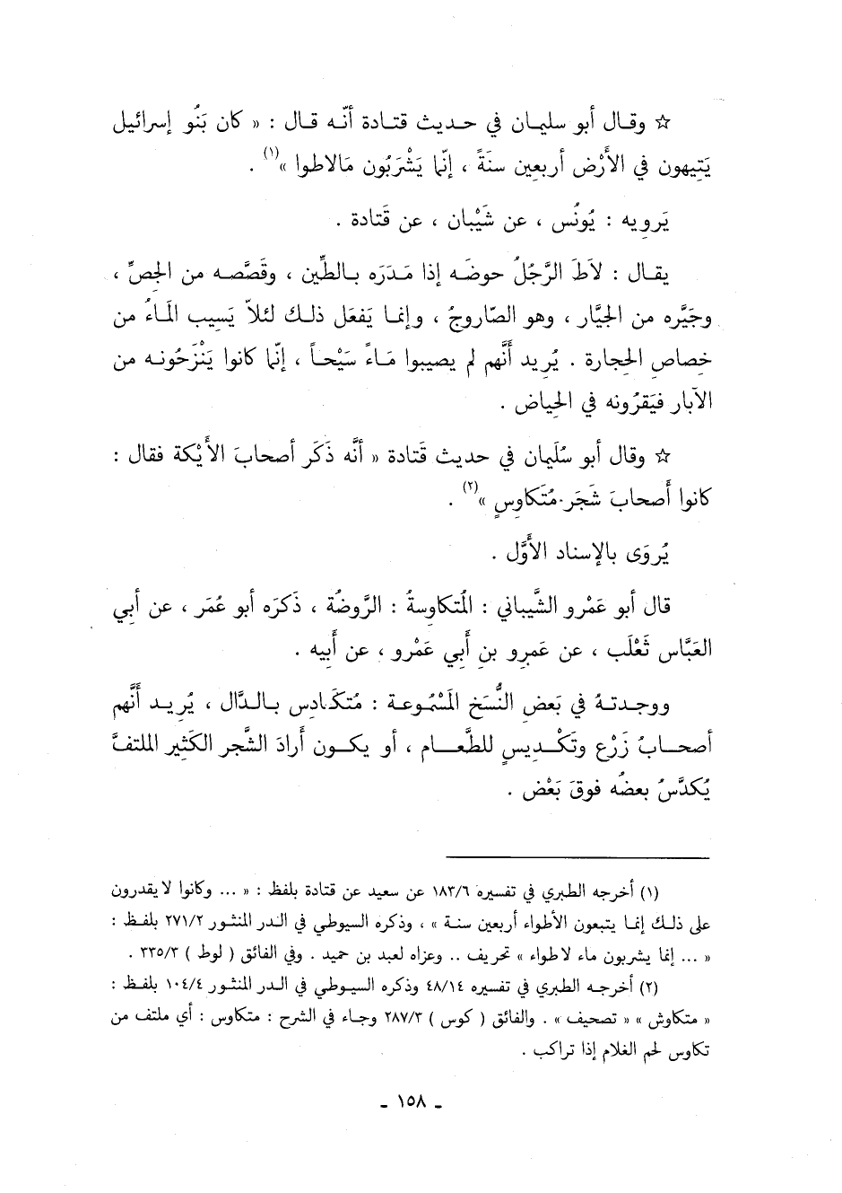 1 أخرجه الطبري في: تفسيره: 183/ 6, عن سعيد, عن قتادة بلفظ: " ... وكانوا لا يقدرون على ذلك, إنما يتبعون الأطواء أربعين سنة"، وذكره السيوطي في: الدر المنثور: 271/ 2, بلفظ: " ... إنما يشربون ماء لاطواء" تحريف, وعزاه لعبد بن حميد, وفي الفائق: "لوط": 335/ 3.