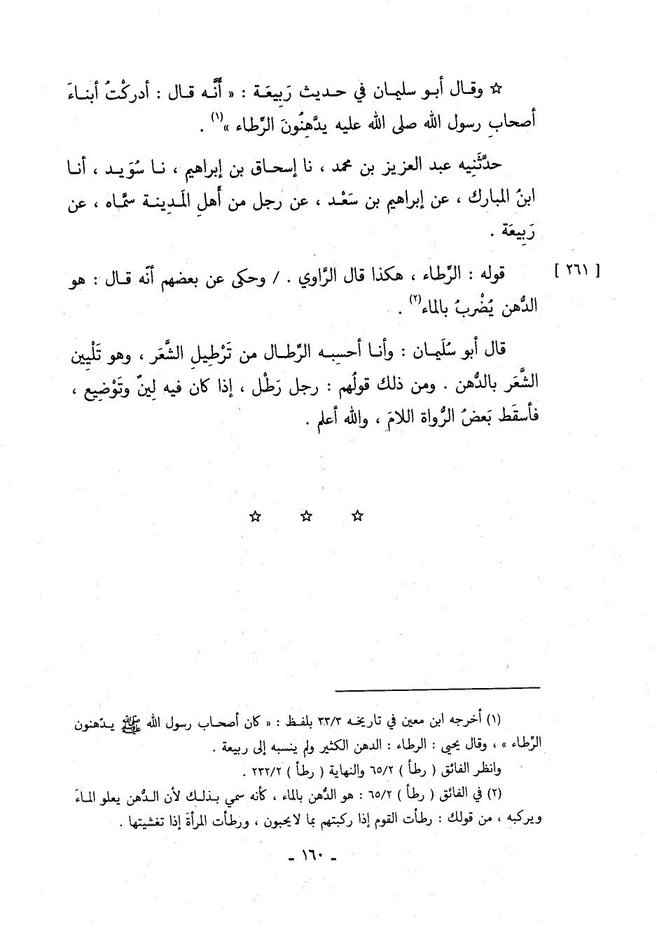 *وَقَال أَبُو سُلَيْمَانَ فِي حديث ربيعة: "أنه قال: أدركت أبناء أَصْحَابِ رَسُولُ اللَّهِ صَلَّى اللَّهُ عليه وسلم يدَّهِنُونَ الرِّطَاء"1.
