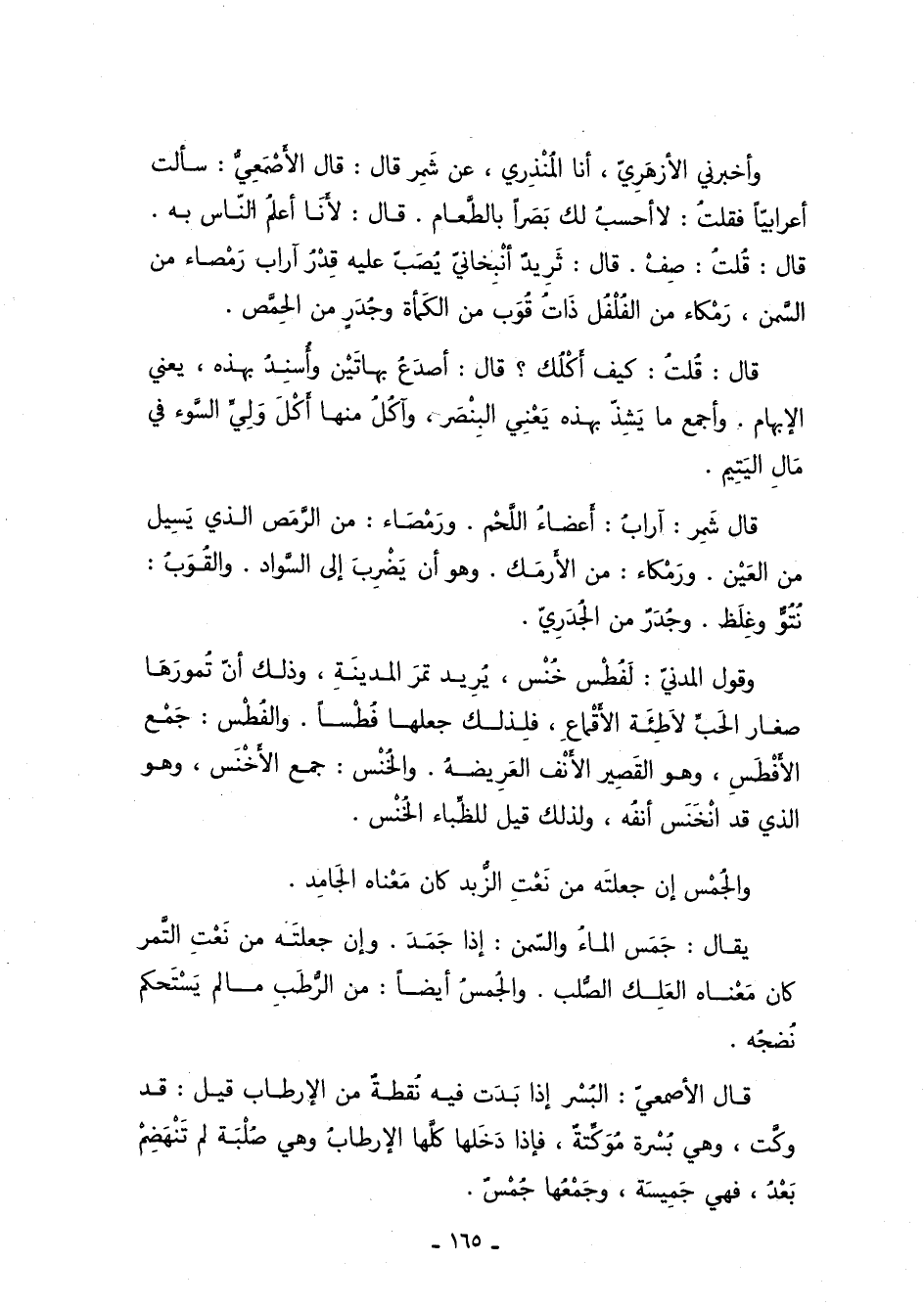 وأخبرني الأزهري، أنا المنذري، عن شمر قال: قال الأصمعي: سألت أعرابِيًّا, فقلت: لا أحسب لك بصرًا بالطعام, قال: لأنا أعلم الناس به, قال: قلت: صِفْ, قال: ثَرِيد أَنْبِخَاني يصب عليه قِدْرُ آراب رَمْصَاء من السمن، رَمْكَاء من الفلفل ذلت قُوَب من الكمأة وجُدَر من الحمص.