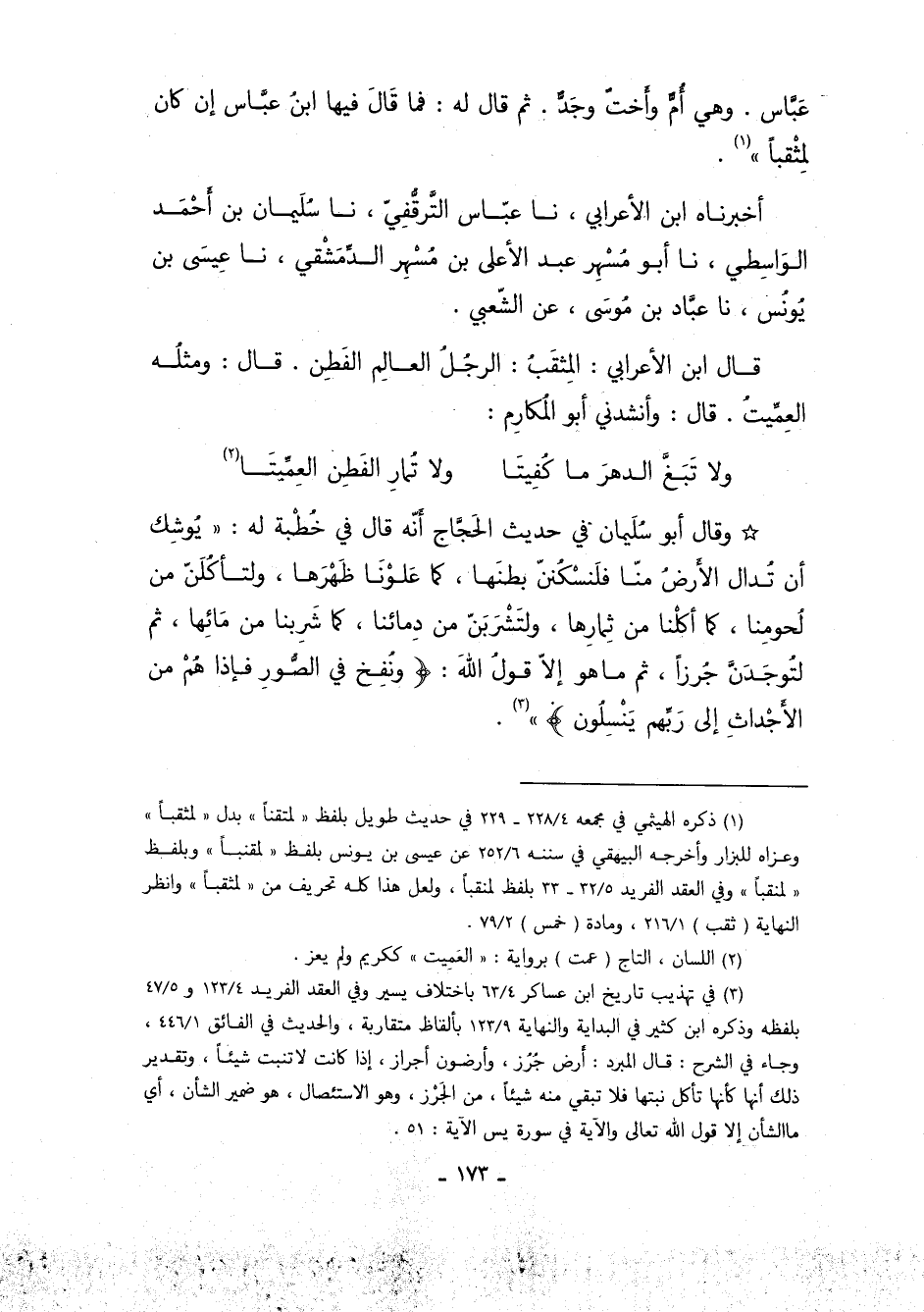 1 في تهذيب تاريخ ابن عساكر: 63/ 4, باختلاف يسير, وفي العقد الفريد: 123/ 4 و 47/ 5, بلفظه, وذكره ابن كثير في: البداية والنهاية: 123/ 9, بألفاظ متقاربة، والحديث في: الفائق: 446/ 1، وجاء في الشرح: قال المبرد: أرض جرز، وأرضون أجراز، إذا كانت لا تنبت شيئًا، وتقدير ذلك أنها كلها تأكل نبتها, فلا تبقى منه شيئًا، من الجرز، وهو الاستئصال، هو ضمير الشأن، أي ما الشأن إلا قول الله تعالى والآية في سورة يس الآية: 51.