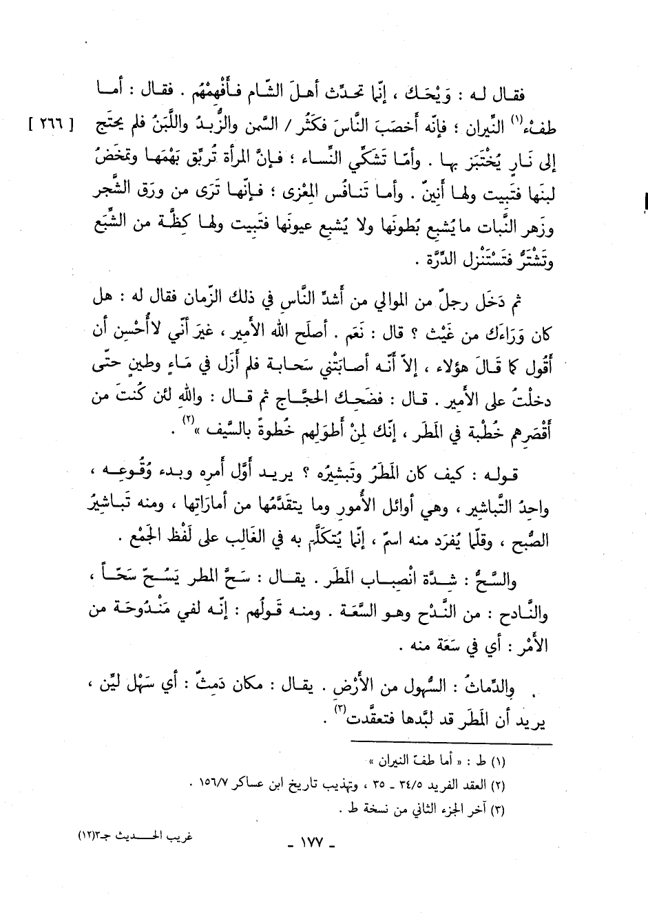 فقال له: ويحك، إنما تحدث أهل الشام فأفهمهم, فقال: أما طَفْءُ 1 النيران؛ فإنه أخصب الناس, فكثر "266" / السمن والزبد واللبن, فلم يحتج إلى نار يختبز بها, وأما تشكي النساء؛ فإن المرأة تربق بهمها وتمخض لبنها, فتبيت ولها أنين, وأما تنافس المعزى؛ فإنها ترى من ورق الشجر وزهر النبات ما يشبع بطونها, ولا يشبع عيونها فتبيت ولها كظة من الشبع وتشتر, فتستنزل الدرة.