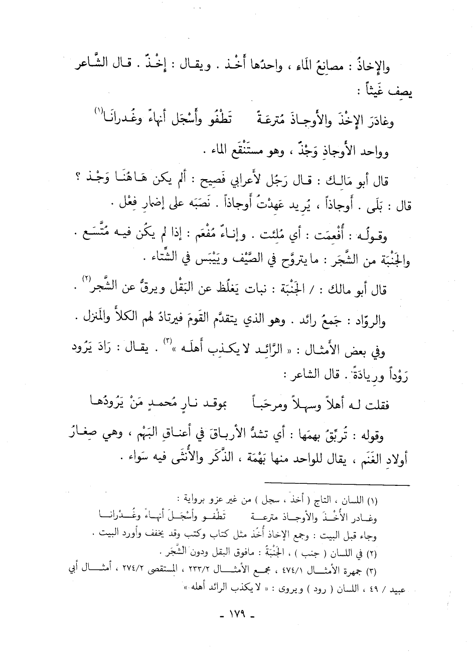 قال أبو مالك: قال رجل لأعرابي فصيح: ألم يكن هاهنا وَجْذ؟ قال: بلى, أوجاذًا، يريد عهدت أوجاذًا, نصبه على إضمار فعل.