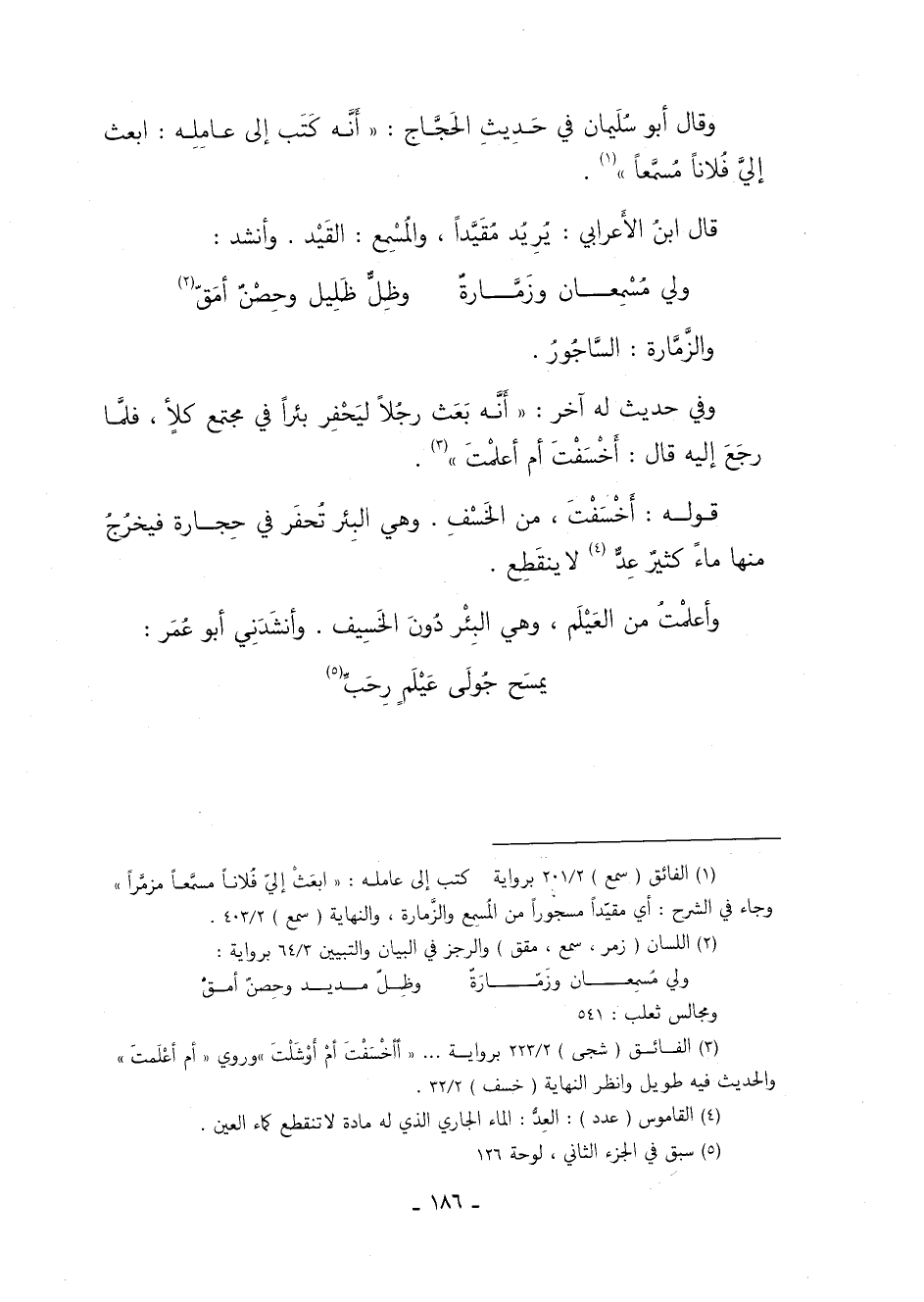 1 الفائق: "سمع": 201/ 2, برواية: كتب إلى عامله: "ابعث إلى فلانًا مسمَّعًا مُزَمَّرًا" وجاء في الشرح: أي مقيَّدًا مسجورًا من المُسمع والزمارة، والنهاية: "سمع": 403/ 2.