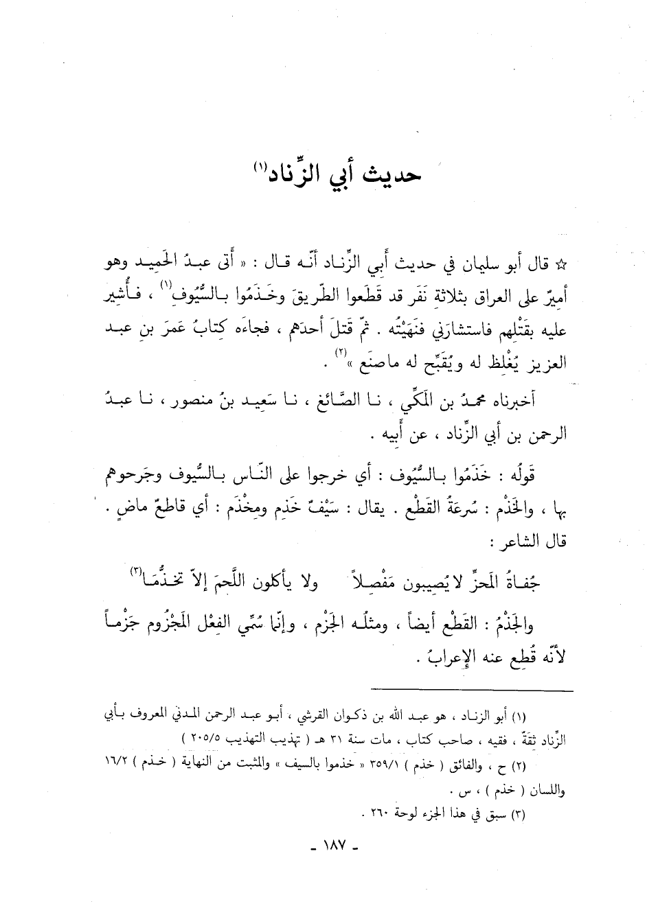 * قَالَ أَبُو سُلَيْمَانَ فِي حَدِيثِ أبي الزناد أنه قال: "أتى عبد الحميد وهو أمير على العراق بثلاثة نفر قد قطعوا الطريق, وخَذَمُوا بالسيوف 1، فأشير عليه بقتلهم فاستشارني فنهيته, ثم قتل أحدهم، فجاءه كتاب عمر بن عبد العزيز يغلظ له ويقبح له ما صنع"2.