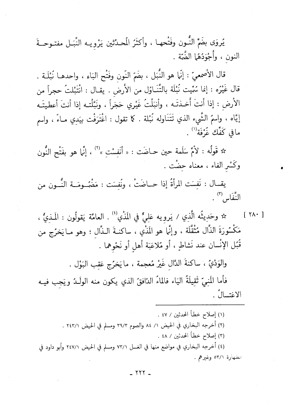 280 * وحديثه الذي يرويه علي في المذي 4, العامة يقولون: المّذِيُّ، مكسورة الذال مثقلة، وإنما هو المَذْيُ، ساكنة الذال, وهو ما يخرج من قبل الإنسان عند نشاط، أو ملاعبة أهل, أو نحوهما.