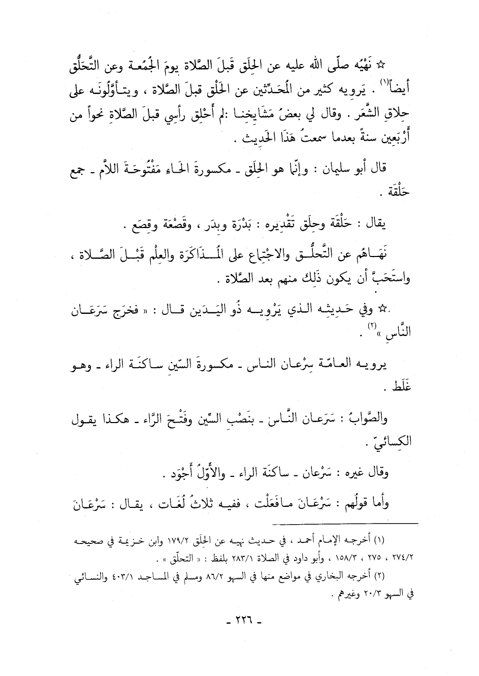 1 أخرجه الإمام أحمد، في حديث نهيه عن الحلق: 179/ 2, وابن خزيمة في: صحيحه: "274/ 2، 275"، "158/ 3"، وأبو داود في: الصلاة: 283/ 1, بلفظ: "التحلق".