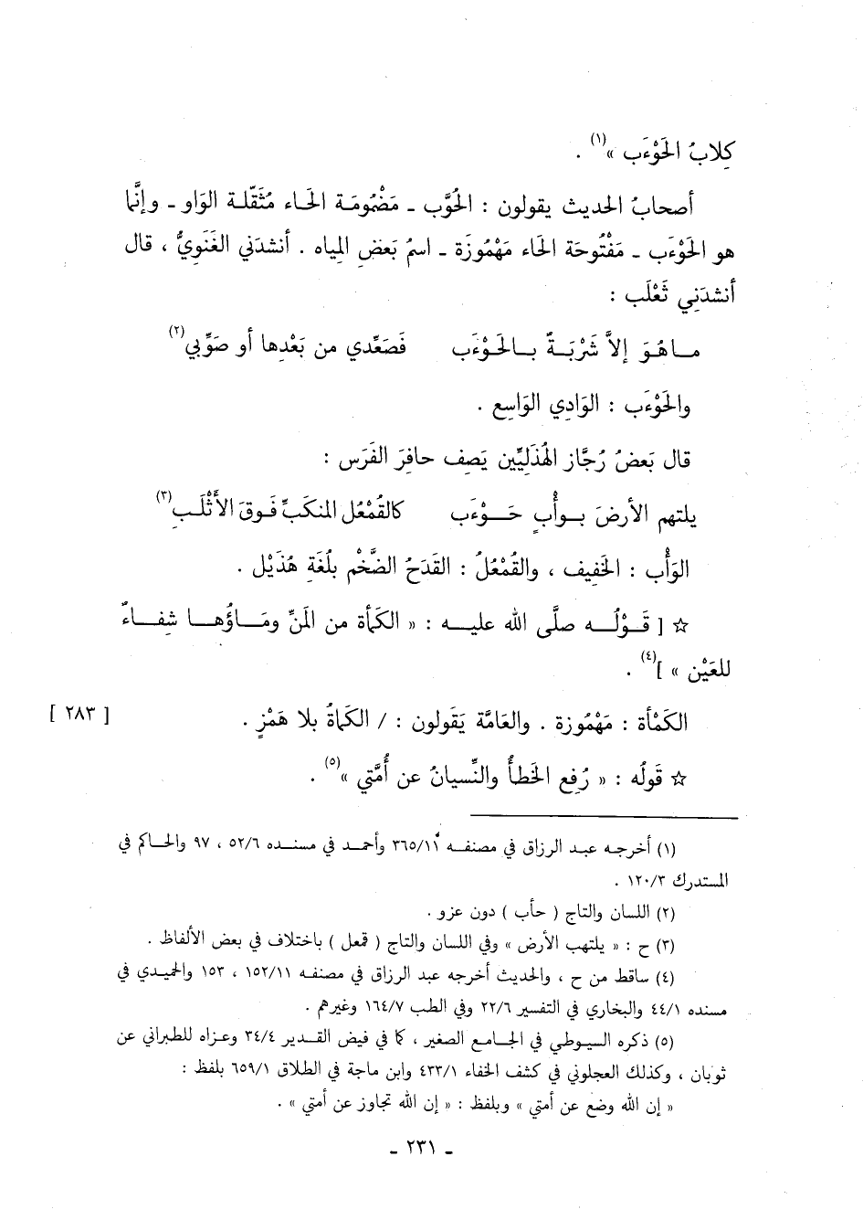 أصحاب الحديث يقولون: الحُوَّب - مضمومة الحاء مثقلة الواو - وإنما هو الحوءب - مفتوحة الحاء مهموزة - اسم بعض المياه, أنشدني الغنوي، قال أنشدني ثعلب: