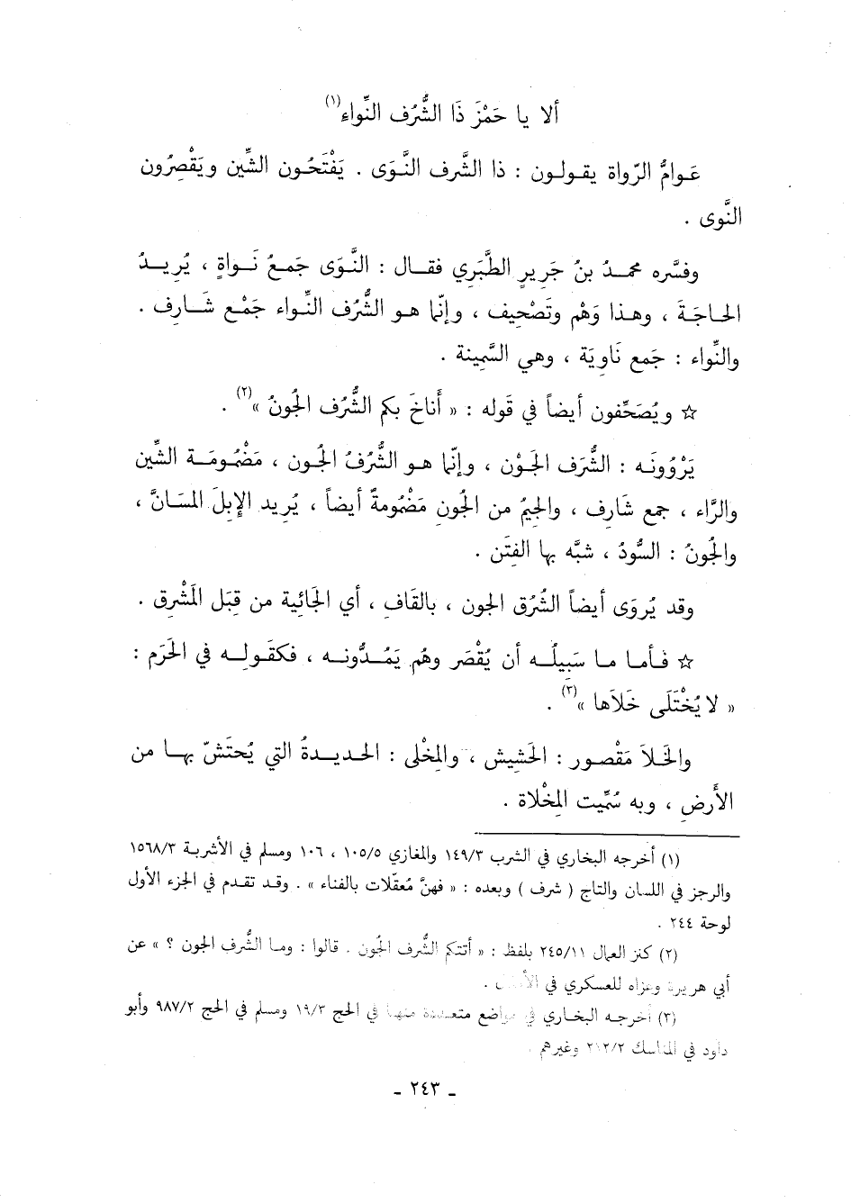 وفسره محمد بن جرير الطبرى, فقال: النَّوَى جمع نَوَاة، يريد الحاجة، وهذا وهم وتصحيف، وإنما هو الشُّرُفُ النِّوَاء جمع شارف, والنِّوَاء: جمع ناوية، وهي السمينة.