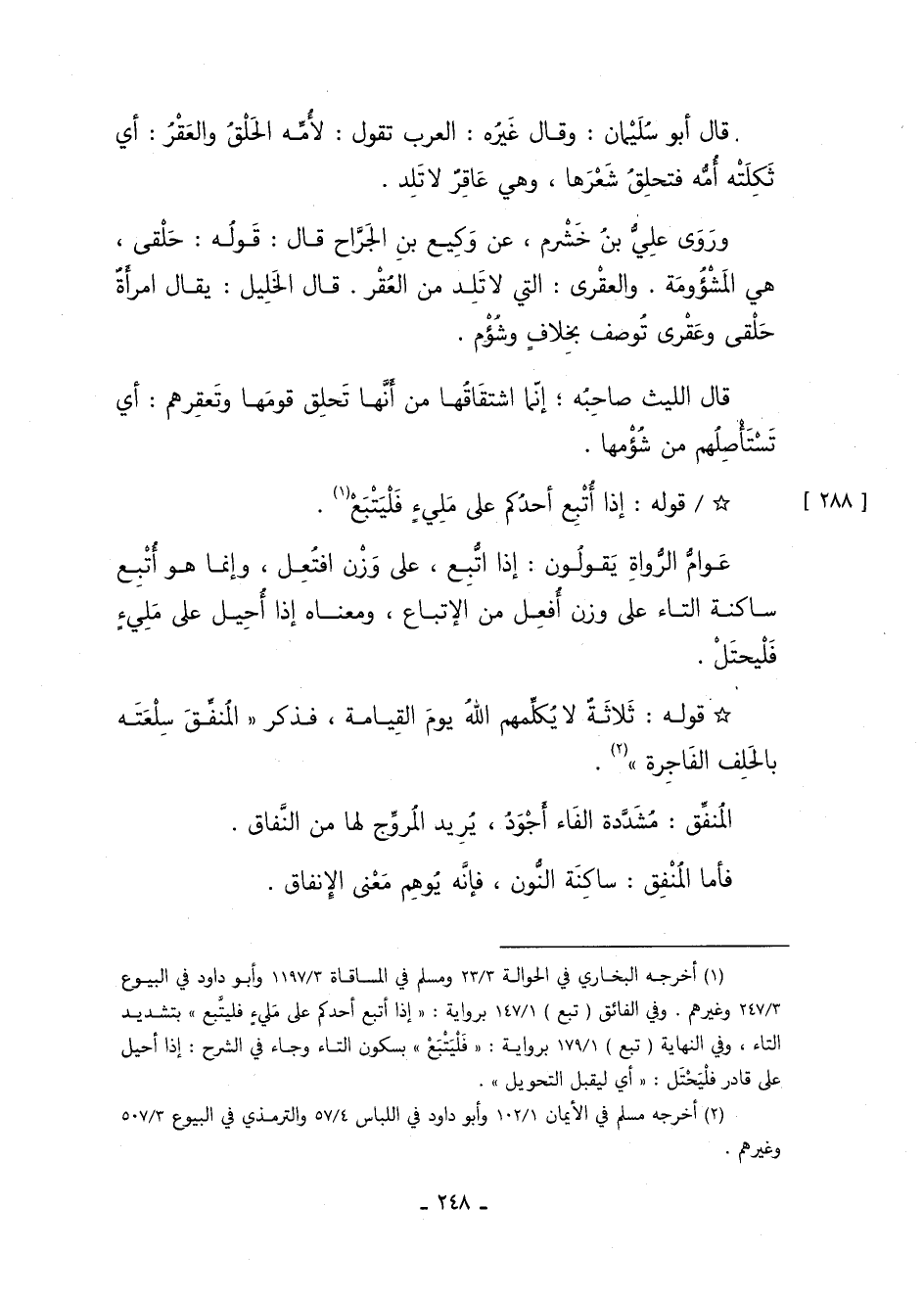 1 أخرجه البخاري في: الحوالة: 23/ 3, ومسلم في: المساقاة: 1197/ 3, وأبو داود في: البيوع: 247/ 3, وغيرهم, وفي الفائق: "تبع": 147/ 1, برواية: "إذا أُتْبِع أحدكم عَلَى مَليءٍ فليتَّبِع" بتشديد التاء، وفي: النهاية: "تبع": 179/ 1, برواية: "فَلْيَتْبَع" بسكون التاء, وجاء في الشرح: إذا أحيل على قادر, فليحتل: "أي ليقبل التحويل".
