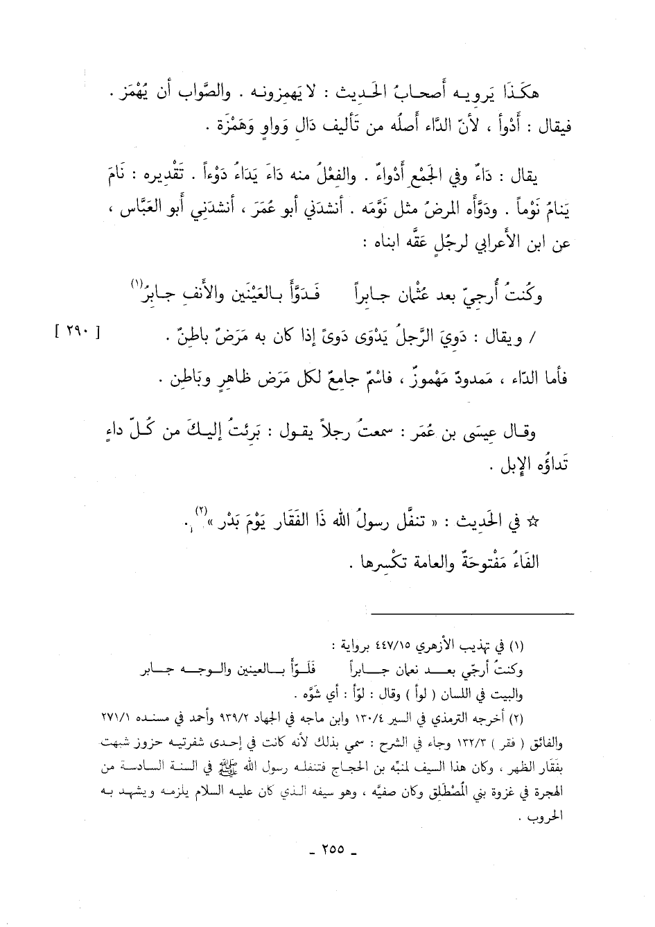 يقال: داء, وفي الجمع أدواء, والفعل منه داء يداء دوءًا, تقديره: نام ينام نومًا, ودَوَّأَه المرض مثل نَوَّمَه, أنشدني أبو عمر، أنشدني أبو العبّاس، عن ابن الأعرابي لرجل عقه ابناه: