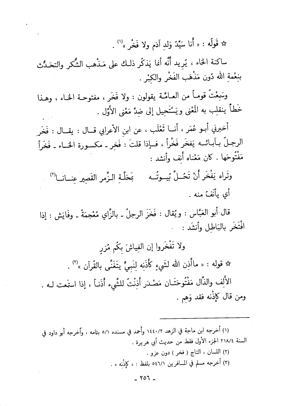 وسمعت قومًا من العامة يقولون: ولا فَخَر، مفتوحة الخاء، وهذا خطأ, ينقلب به المعنى, ويستحيل إلى ضد معنى الأول.