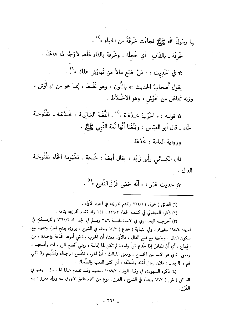 * قوله: "الحرب خَدْعة" 3, اللغة العالية: خَدْعَة- مفتوحة الخاء - قال أبو العباس: وبلغنا أنها لغة النبي صَلَّى اللَّهُ عليه وسلم.