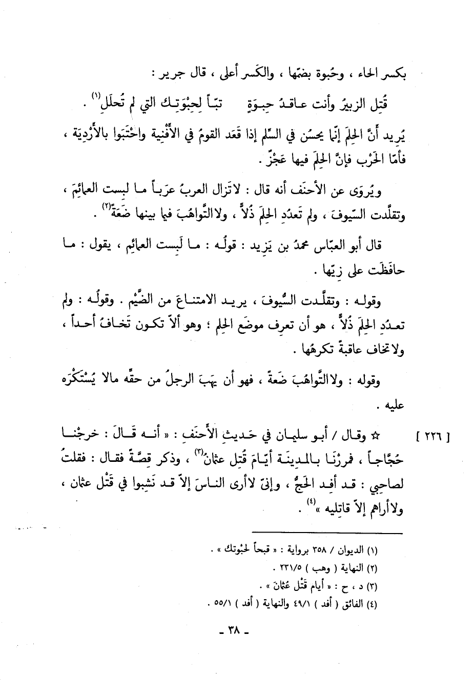 ويروى عن الأحنف أنه قال: "لا تزال العرب عربًا ما لبست العمائم، وتقلدت السيوف، ولم تعدد الحلم ذلًّا، ولا التواهب فيما بينها ضَعَة"2.