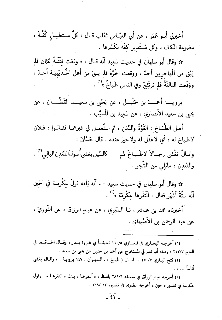 * وَقَالَ أَبُو سُلَيْمَانَ فِي حَدِيثِ سعيد أنه قال: "وقعت فتنة عثمان, فلم يبق من المهاجرين أحد، ووقعت الحرة فلم يبق من أهل الحديبية أحد، ووقعت الثالثة فلم ترتفع, وفي الناس طَبَاخ"1.