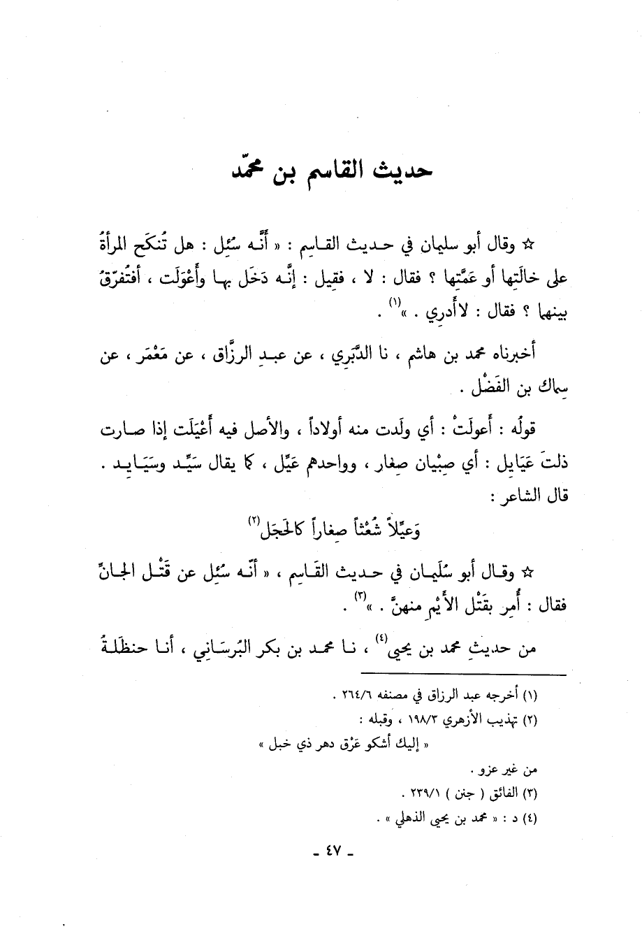حديث القاسم: أنه سئل: هل تنكح المرأة على خالتها أو عمتها؟ .....