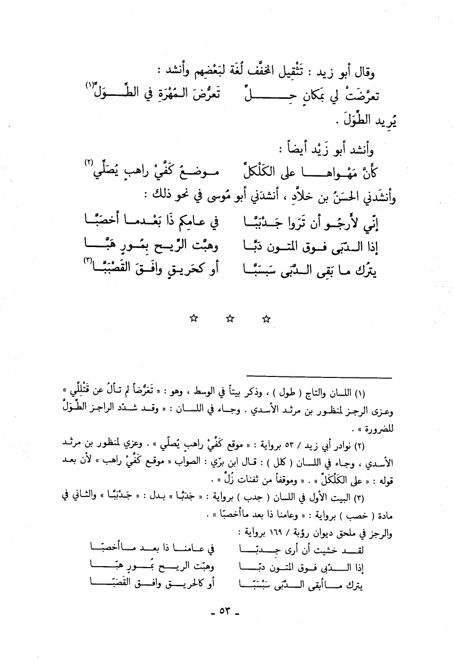 2 نوادر أبي زيد: 53 برواية: "موقع كفي راهب يصلى". وعزي لمنظور بن مرثد الأسدي، وجاء في اللسان "كلل": قال ابن بري: الصواب: "موقع كفي راهب" لأن بعد قوله: "على الكلكل", و"موقفاً من ثفنات زُلِّ".