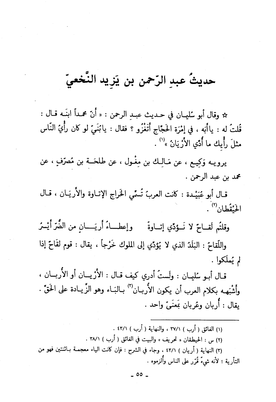 *وَقَالَ أَبُو سُلَيْمَانَ فِي حَدِيثِ عبد الرحمن: "أن محمدا ابنه قال: قلت له: يا أَبَه، في إِمْرَة الحجاج أَتَغْزُو؟ فقال: يا بني لو كان رأي الناس مثل رأيك ما أُدِّيَ الأَرْيَانُ"1.