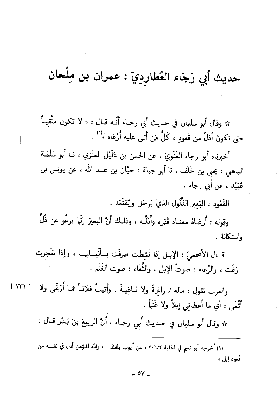 حديث أبي رجاء أنه قال: "لا تكون متقيًا حتى تكون أذل من قَعُود، كل من أتى عليه أَرْغَاه"