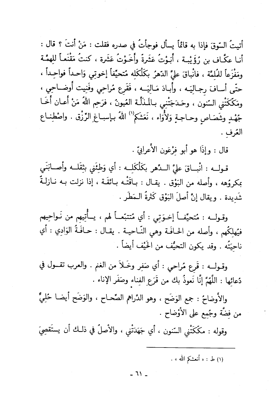 أتيت السوق, فإذا به قائماً يسأل, فوجَأْتُ في صدره فقلت: من أنت؟ قال: أنا عكَّاف بن رؤيبة، أَبَوْتُ عشرة وأَخَوْتُ عشرة، كنت مَقْنَعًا للهِمة ومفزعًا للملمة، فانْبَاقَ عليَّ الدهر بكلكله مُتَحَيِّفًا إخوتي واحداً فواحداً، حتى أَسَاف رِجَاليَه، وأَبَاد مالِيَه، فقَرِع مُرَاحي وفنيت أوضاحي، وَمَكَّكَتْنِي السنون، وحَدَجَتْنِي بالمذلة العيون، فرحم الله من أعان أخا جُهْدٍ وشَصَاص وحاجة ولَأْوَاء، نَعَشَكم 1 الله بإسباغ الرزق, واصطناع العُرْف".