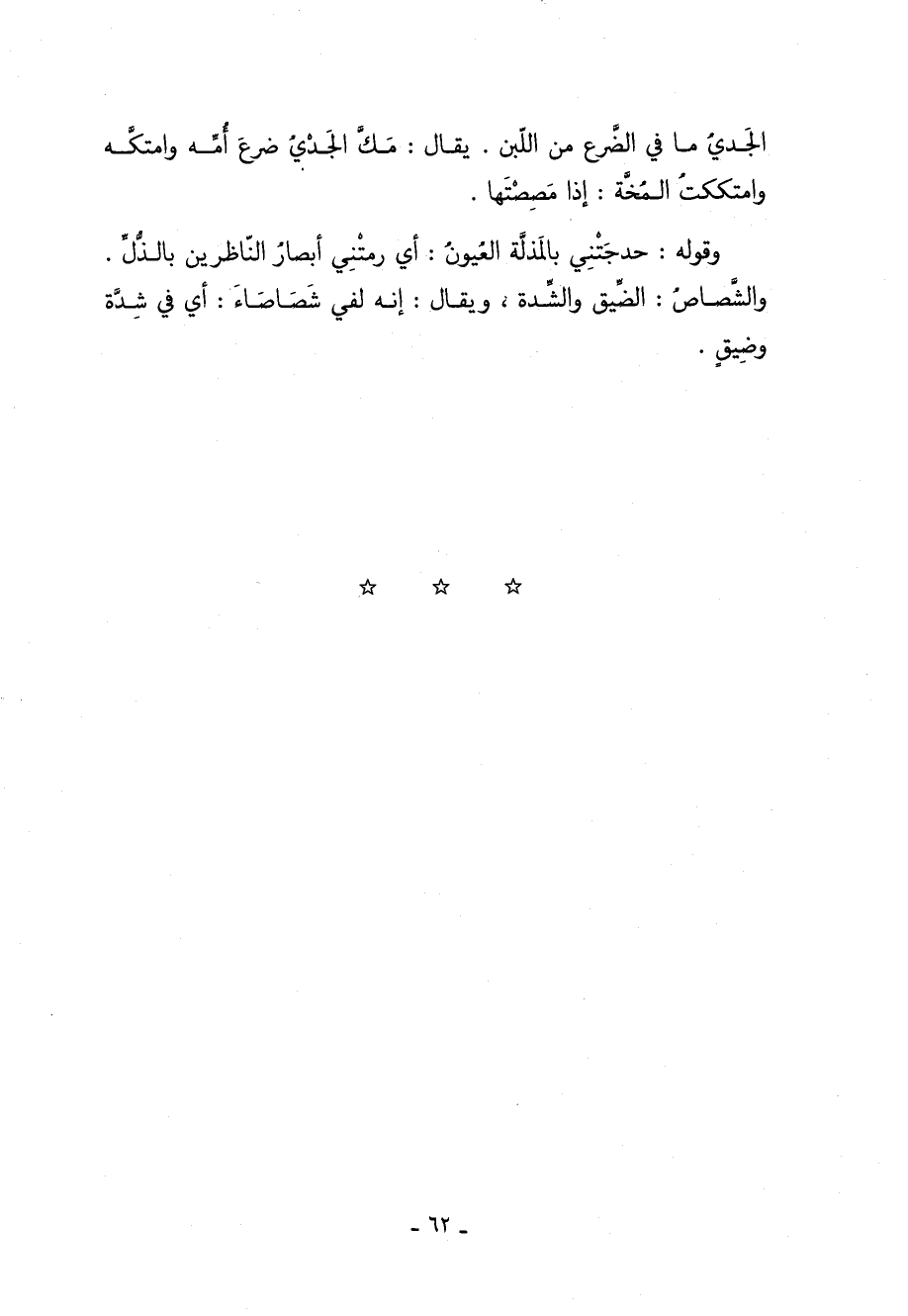 وقوله: حدجتني بالمذلة العيون: أي رمتني أبصار الناظرين بالذل, والشَّصَاص: الضيق والشدة, ويقال: إنه لفي شَصَاصاء: أي في شدة وضيق.