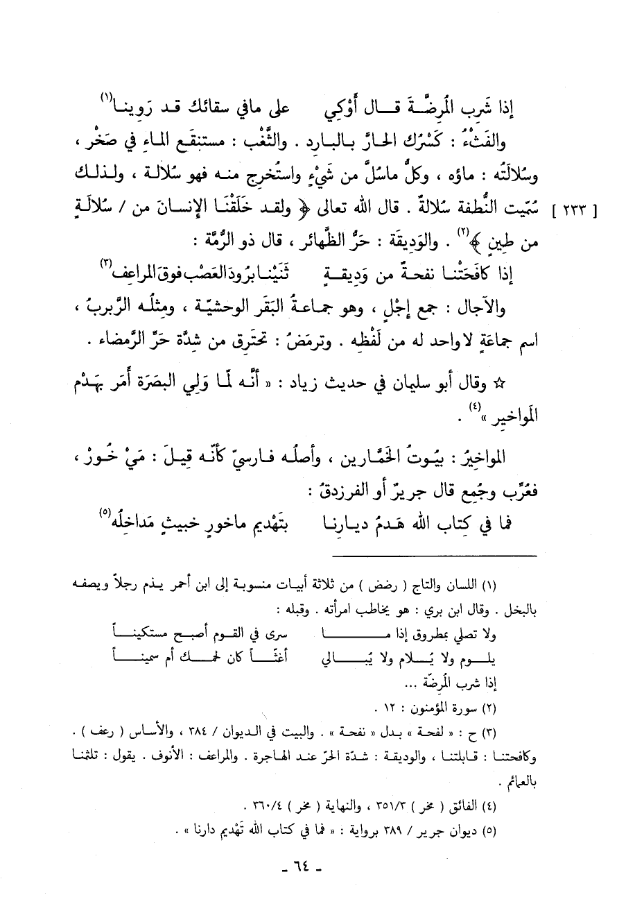 والثَّغْب مستنقع الماء في صخر، وسُلالته: ماؤه, وكل ما سل من شيء واستخرج منه فهو سلالة، ولذلك سميت النطفة سلالة. قال الله تعالى: "233" / {وَلَقَدْ خَلَقْنَا الْإِنْسَانَ مِنْ سُلالَةٍ مِنْ طِينٍ} 2, والوَدِيقة: حر الظهائر قال ذو الرمة: